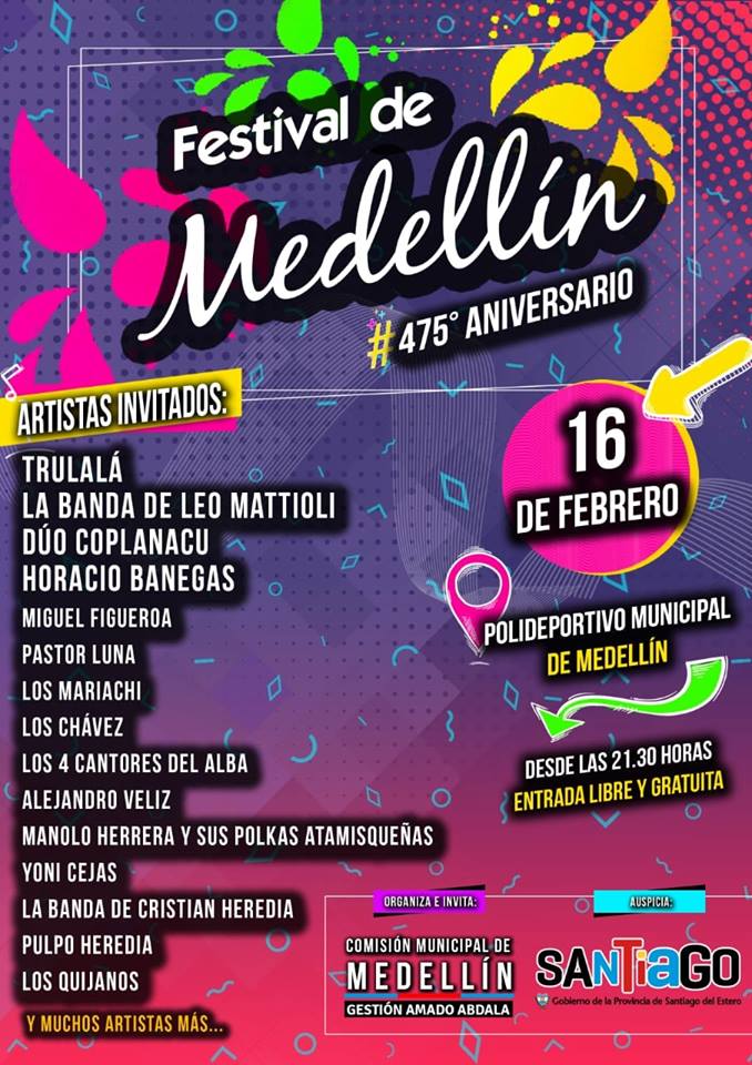 Sabado 16: Festival 475 Aniversario de Medellin. Polideportivo Municipal, Medellin, Atamisqui.